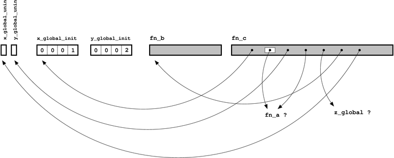 1 2 3 4 5 6 7 8 9 10 | Name Value Class Type Size Line Section fn_a | | U | NOTYPE| | |*UND* z_global | | U | NOTYPE| | |*UND* fn_b |00000000| t | FUNC|00000009| |.text x_global_init |00000000| D | OBJECT|00000004| |.data y_global_uninit |00000000| b | OBJECT|00000004| |.bss x_global_uninit |00000004| C | OBJECT|00000004| |*COM* y_global_init |00000004| d | OBJECT|00000004| |.data fn_c |00000009| T | FUNC|00000055| |.text |