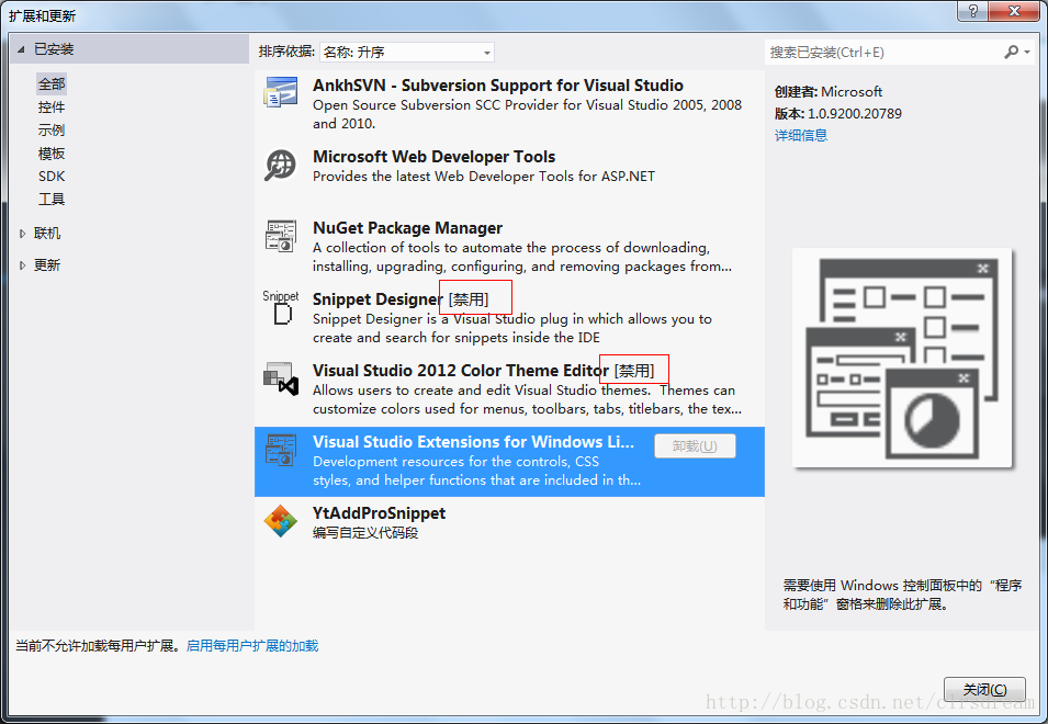 在vs2012 里安装完插件,重启VS,结果 插件没有加载,查看 扩展和更新,里面显示禁用,如图: