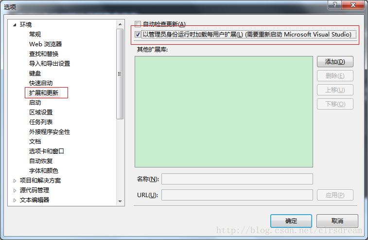 选中 以管理员运行时加载每用户扩展,重启VS即可。